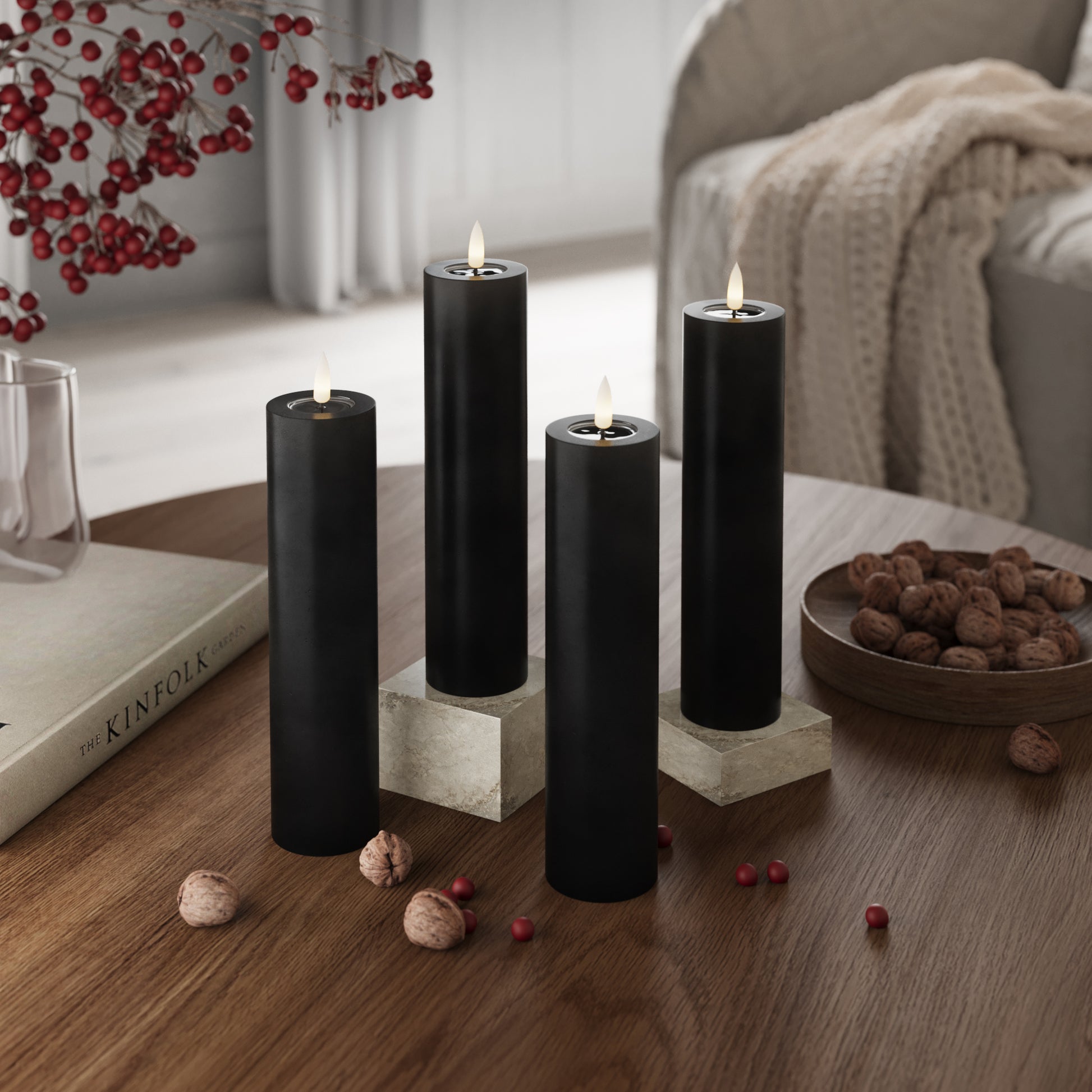 Bloklys er perfekte til dekorationer. Saml dem på et fad, i en lanterne eller i vindueskarmen for en rolig stemning.