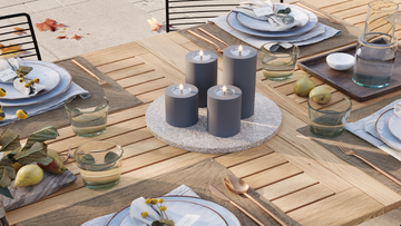 For et roligt helhedsindtryk kan du samle lysene på et fad og variere højderne, mens farverne holdes i samme palette.